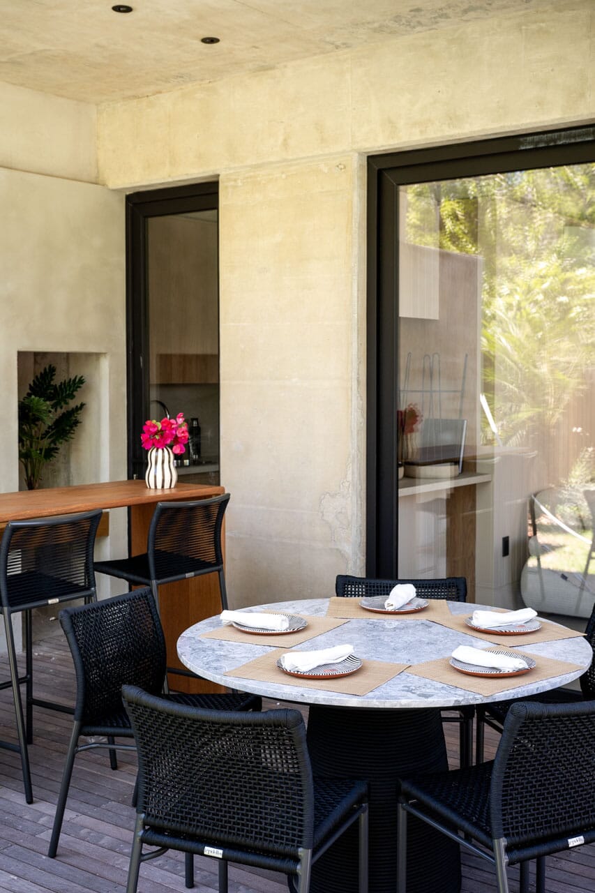 Mesa de comedor, base solida recubierta en cuerda náutica y tapa de marmol. Medidas: Altura: 75cm | Diametro: 120cm.
