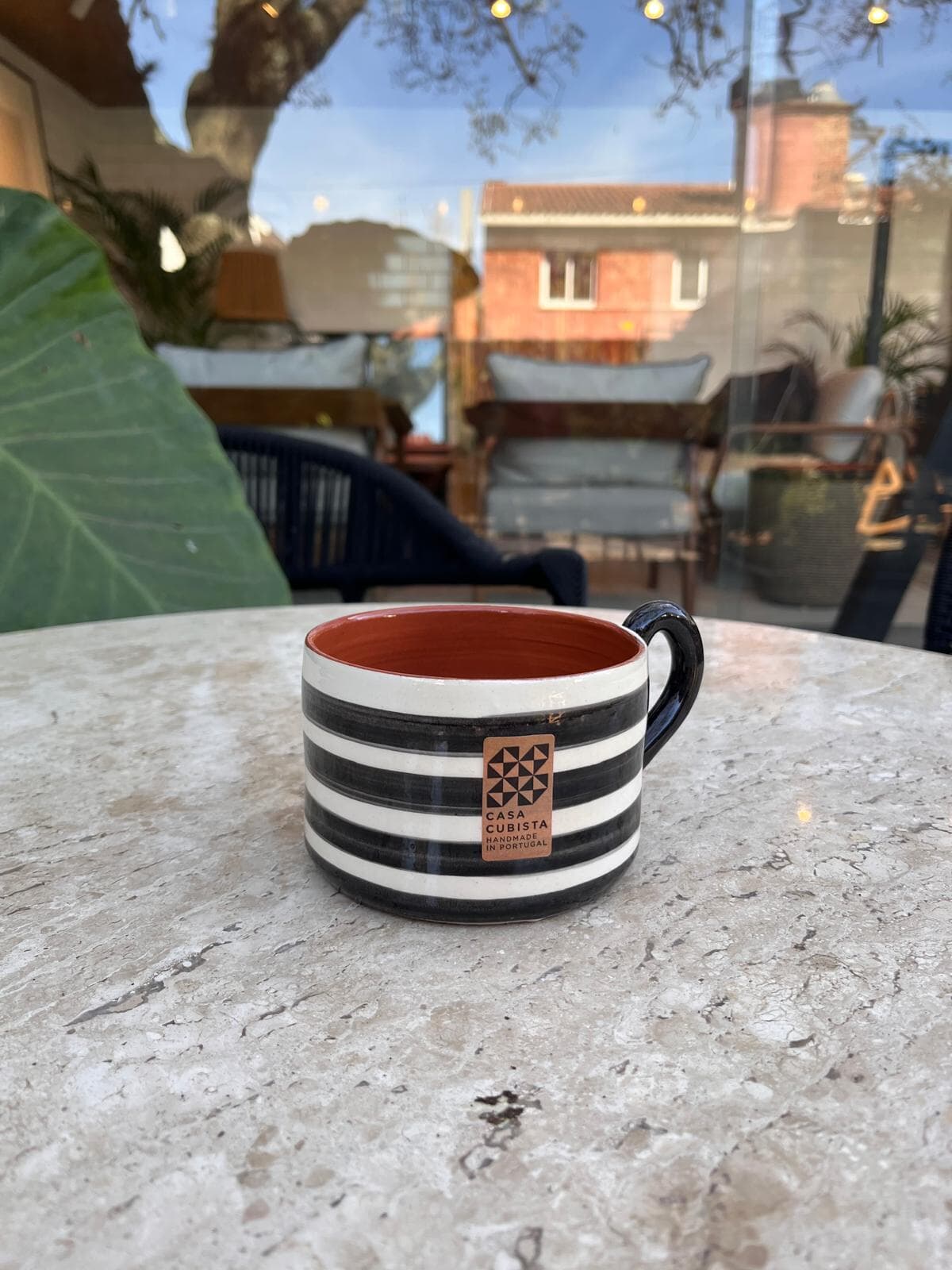 Tasa grande rayada gruesa. Medidas: 11 cms x H: 7.5cms. Vajilla de cerámica artesanal hecha a mano en Portugal. Piezas únicas e irrepetibles. Es posible encontrar diferencias entre las diferentes piezas, es parte del encanto del trabajo artesano.