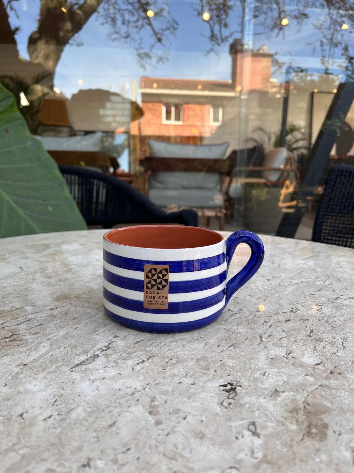 Tasa grande rayada gruesa. Medidas: 11 cms x H: 7.5cms. Vajilla de cerámica artesanal hecha a mano en Portugal. Piezas únicas e irrepetibles. Es posible encontrar diferencias entre las diferentes piezas, es parte del encanto del trabajo artesano.