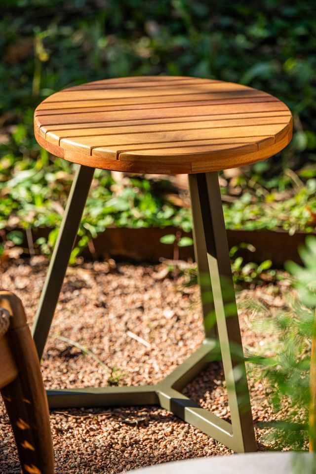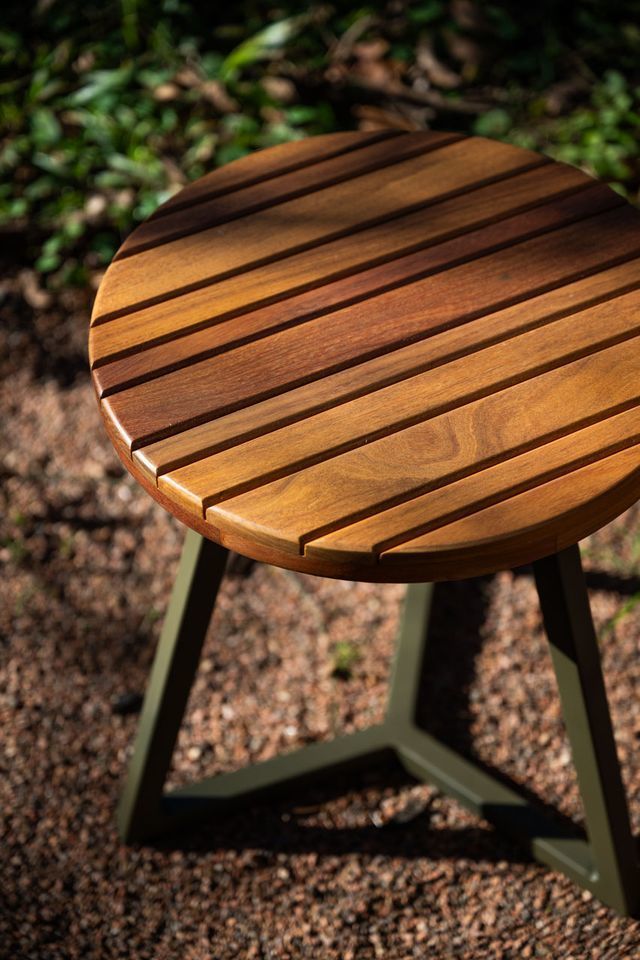 Mesa auxiliar aluminio verde oliva con tapa de madera. Medidas: 0.50 x 0.50 x H0.50