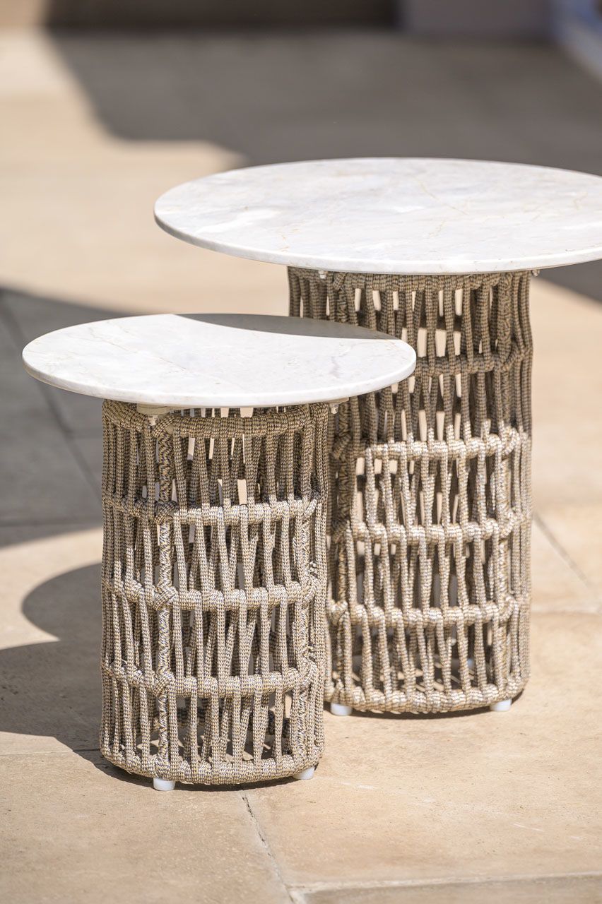 Mesa auxiliar base de cuerda naútica y tapa de mármol. Medidas: Altura: 43cm | Diametro: 40cm.